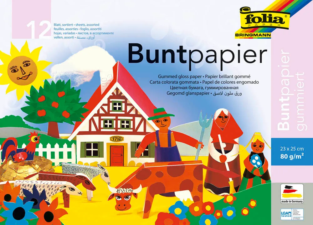 Das FOLIA Buntpapierheft umfasst 12 Blatt farbig sortiertes Papier mit einem Papiergewicht von 80 g/ m². Durch die einseitig gummierte Oberfläche haftet das Papier nach dem Anfeuchten auf dem gewünscht en Untergrund.