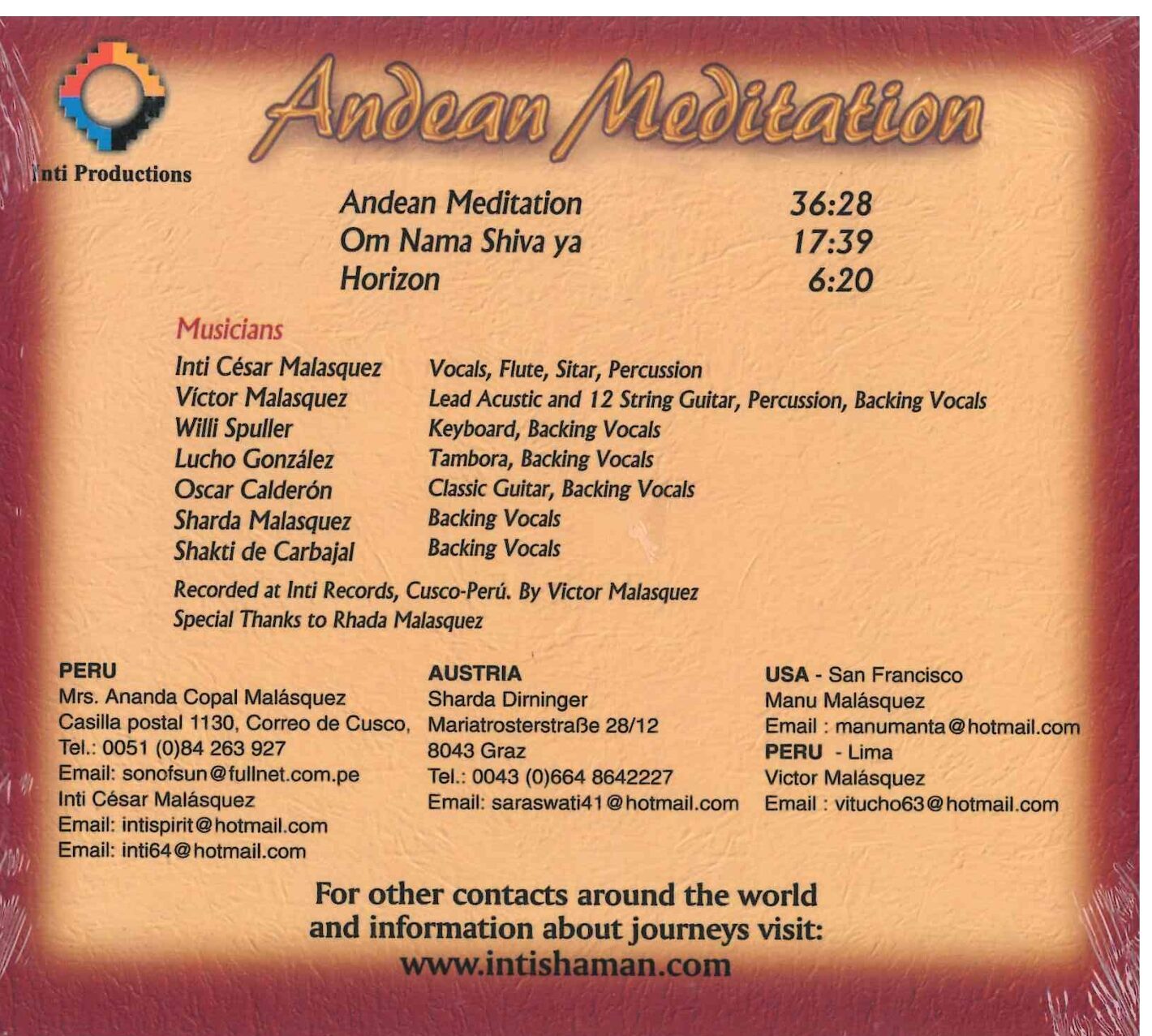 Inti ist Inka-Schamane, Musiker und Heiler. Seit seinem 18. Lebensjahr bereist er viele Länder der Welt und praktiziert schamanische Lehren. Zehn Jahre lang studierte er in Varanasi bei einem Brahmanen Yoga, lernte Sitar und Gitarre zu spielen sowie Mantras zu rezitieren.