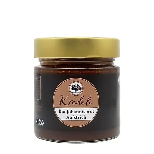 Die Früchte des Johannisbrotbaumes werden natürlich getrocknet und per Hand geerntet. Anschließend wird daraus ein Sirup hergestellt. Der Kredeli Bio-Johannisbrot Aufstrich besteht zu sechzig Prozent aus diesem Sirup. Dazu kommen Bio-Tahin (Sesammus) und Bio-Haselnüsse.