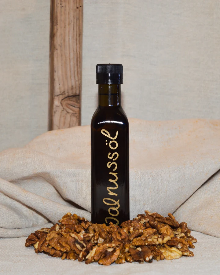 Von Anbau über Pressen bis zum Abfüllen geschieht alles bei uns auf dem Hof, dadurch können wir die ausgezeichnete Qualität unseres Walnussöls garantieren. Dafür erhalten wir regelmäßig Auszeichnungen z.B. letztes Jahr Gold bei der Wieselburger Ölprämierung “Öl-Kaiser 2023”!