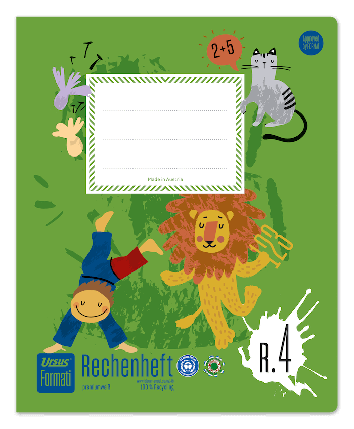 Das URSUS Formati Rechenheft ist zur Gänze aus in Österreich hergestelltem Pure Impact Recyclingpapi er und mit dem Österreichischen Umweltzeichen sowie dem Blauen Engel ausgezeichnet. Das Heft im Quar tformat beinhaltet 20 karierte Blätter mit 5 x 5 mm Kästchen und hat eine Mittellinie, einen eingerü ckten Farbrand und abgerundete Ecken.